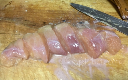 Нарезаем икру и печень небольшими кусками, закидываем в суп.