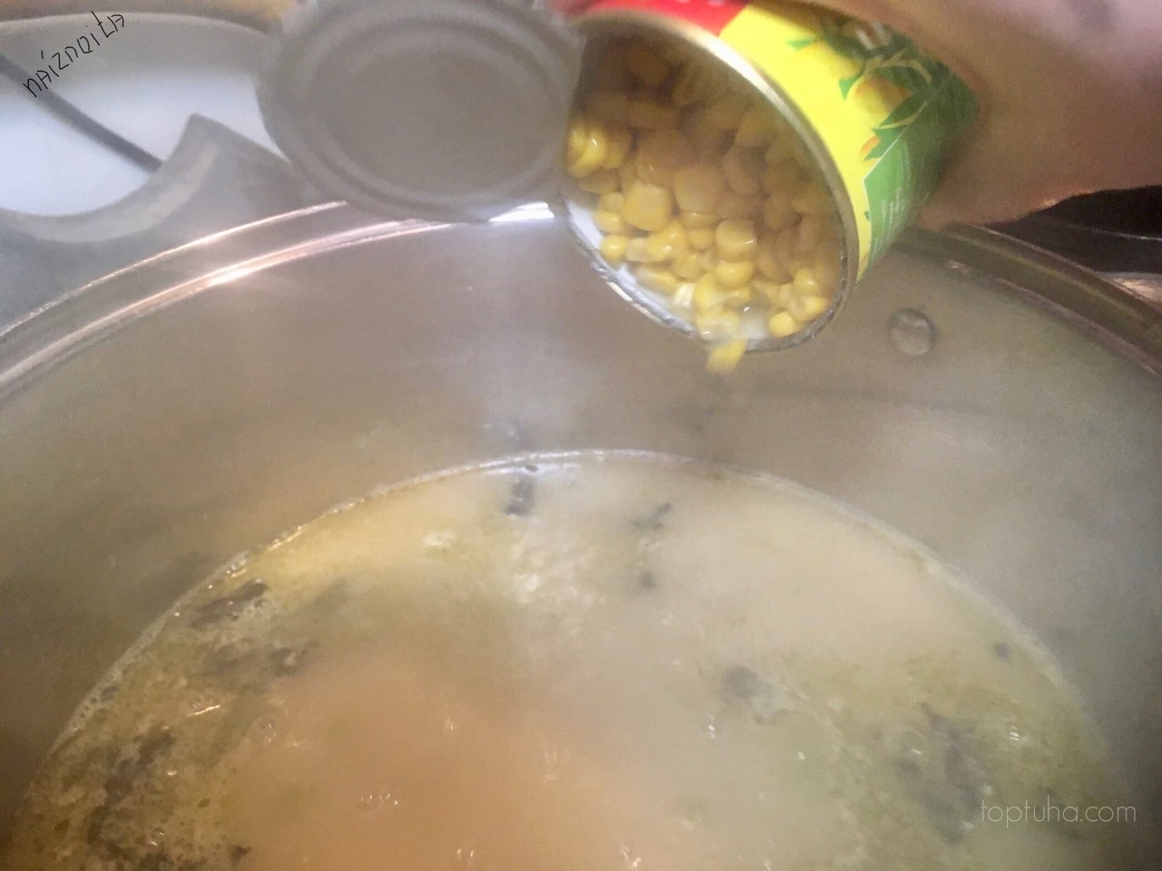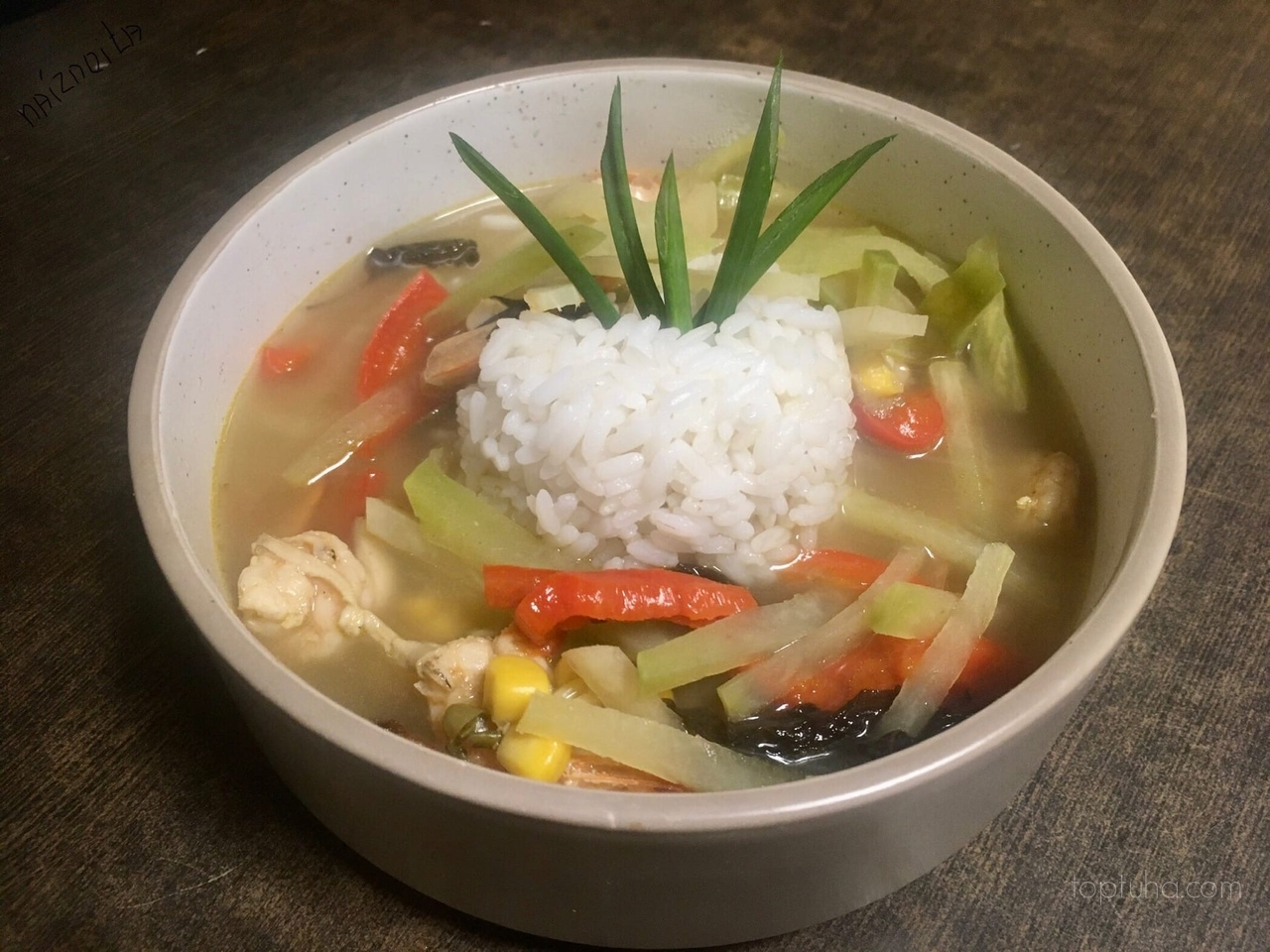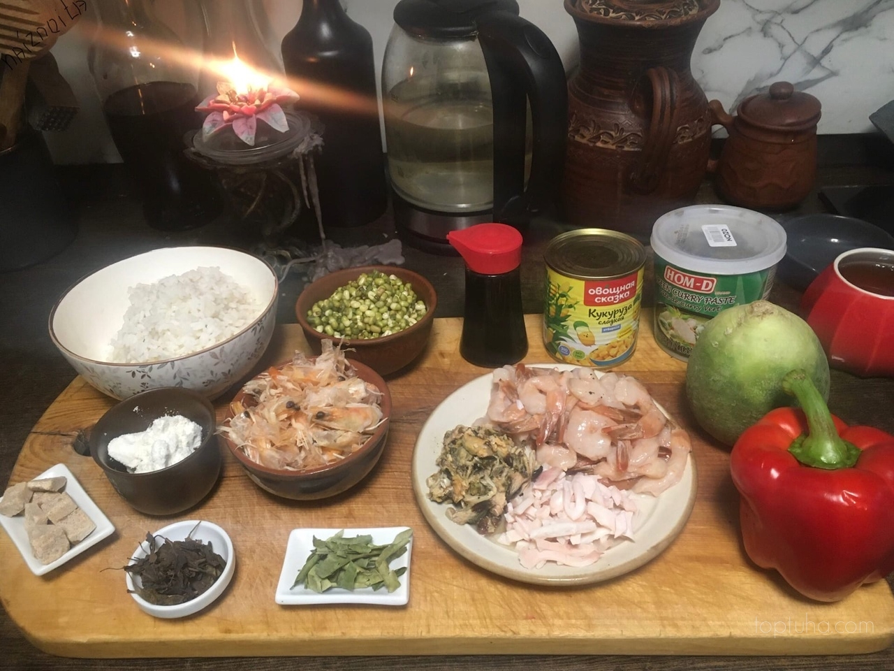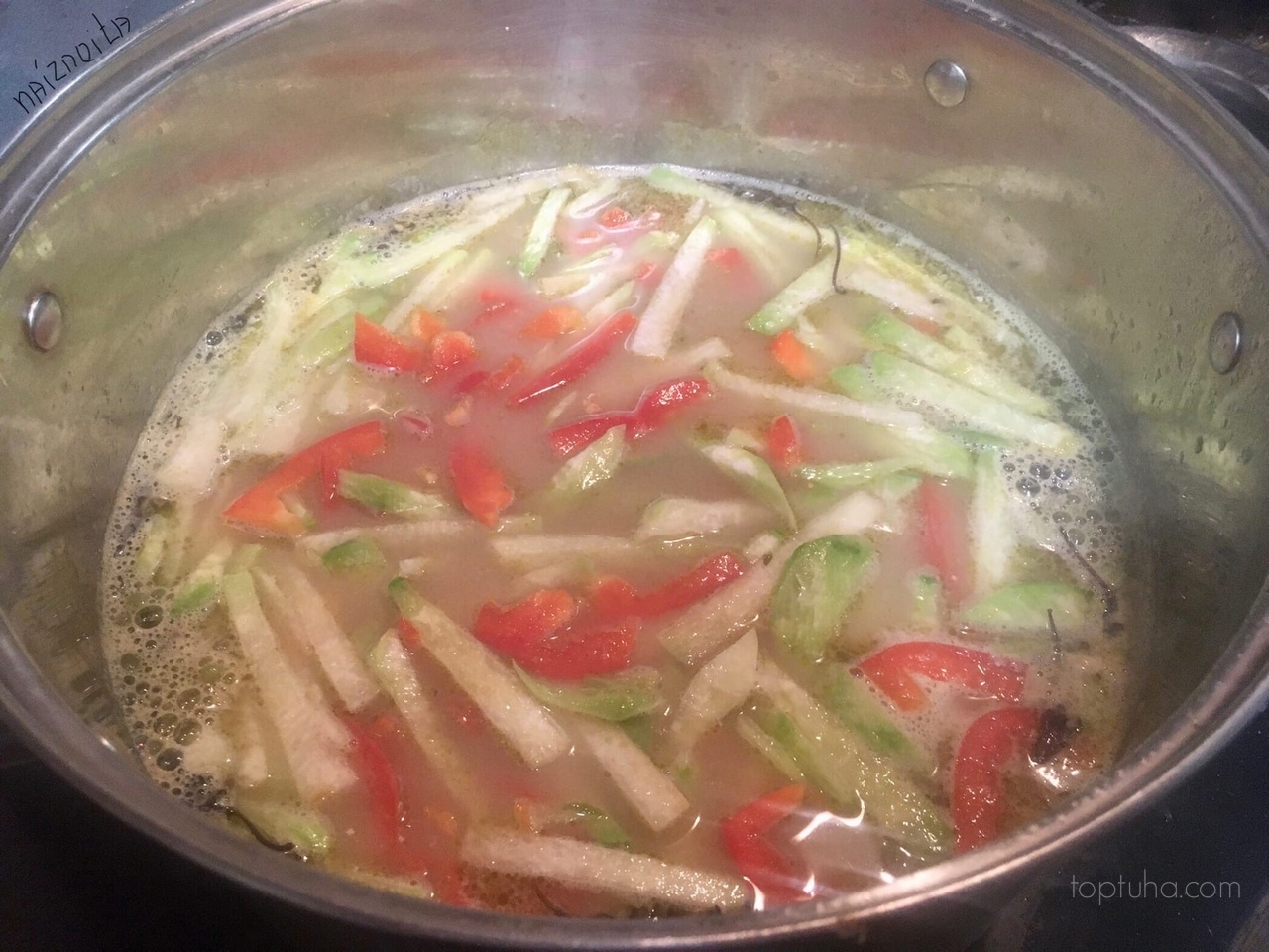 В оригинале идут маленькие початочки молочной кукурузы, но стоят они как чугунный мост, так что и обычная кукуруза норм заходит. Тем более что она неплохо дружит со сладостью тростникового сахара. Так же в оригинале добавляют ростки бамбука, спаржу, тофу и пр. Чаще в рецептах всё это заменяют на более привычные русскоматерящемуся человеку аналоги: зелёную фасоль, горошек и даже картошку. Для меня это дикость. Если заменять, то теми овощами которые тайцы добавляют в свои супы. У меня зелёная редька (можно взять дайкон) и болгарский перец. Их я режу соломкой и тоже кладу в суп.