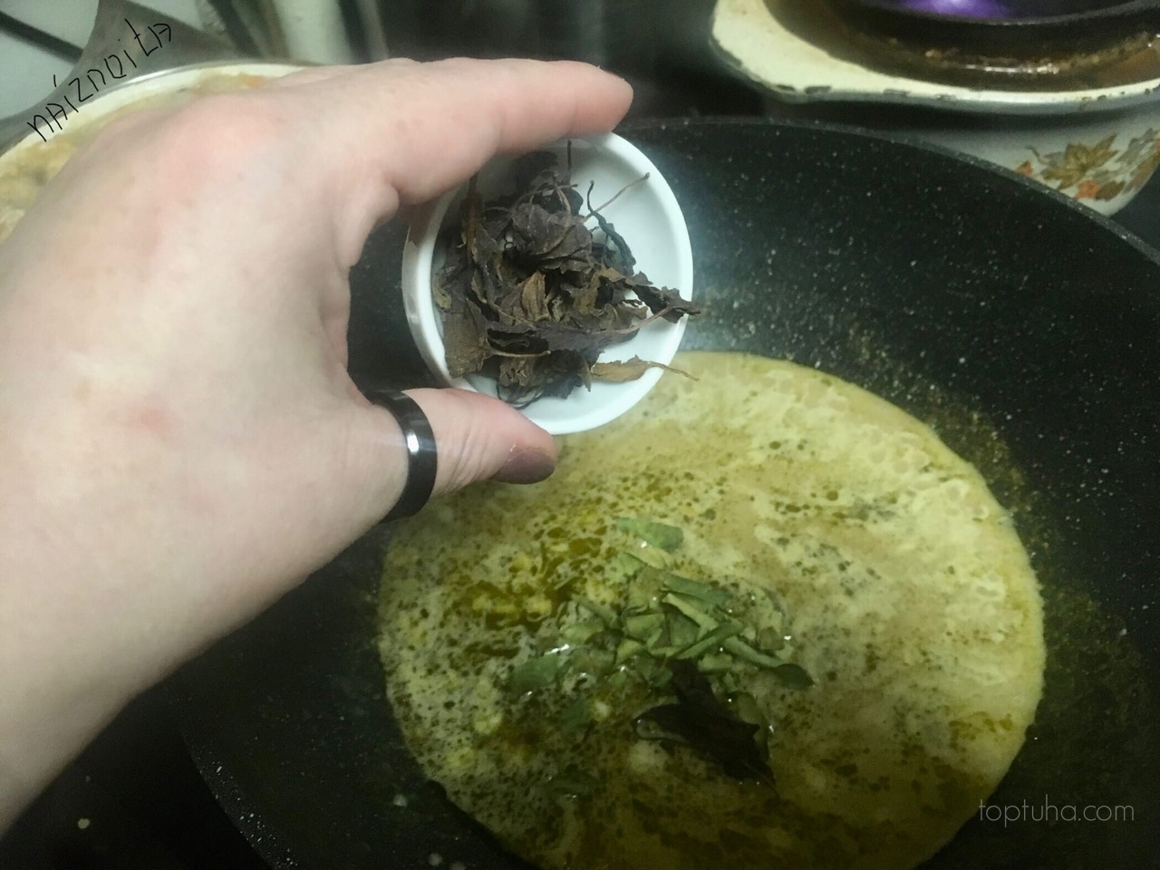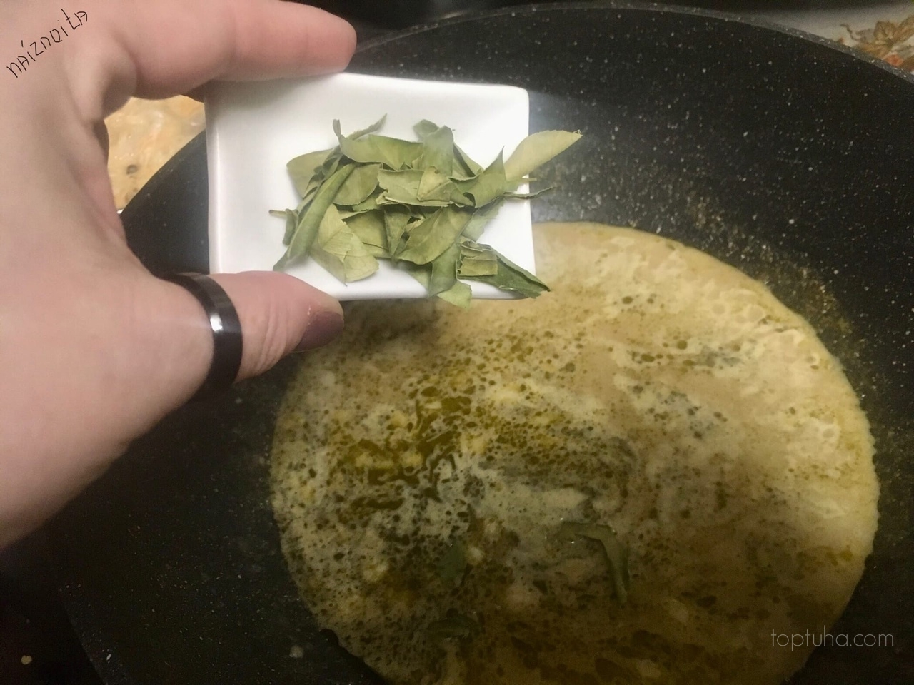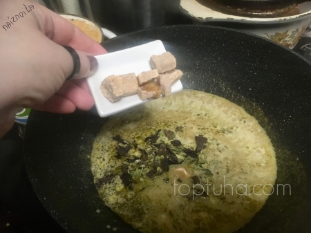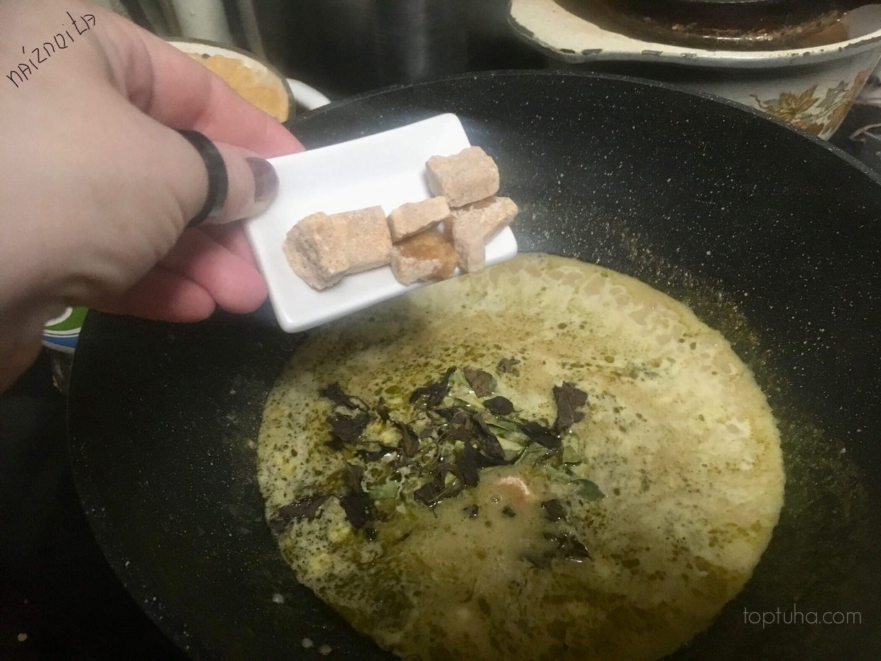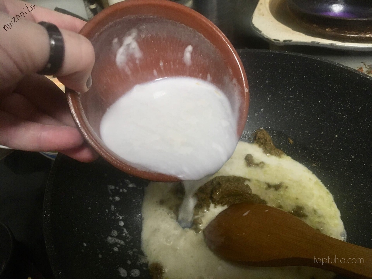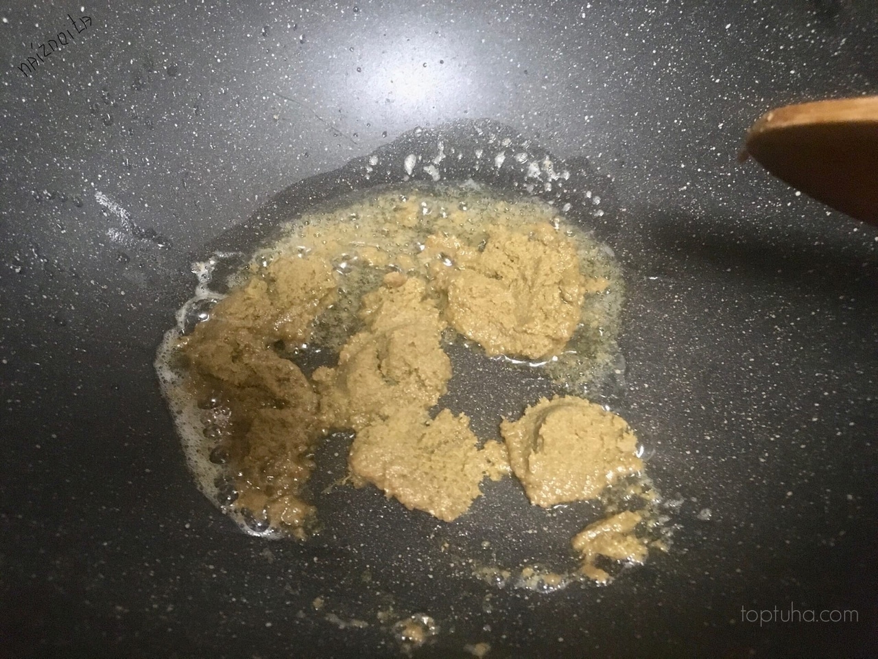 Пасту карри обжариваем на растительном масле постоянно помешивая до аромата,