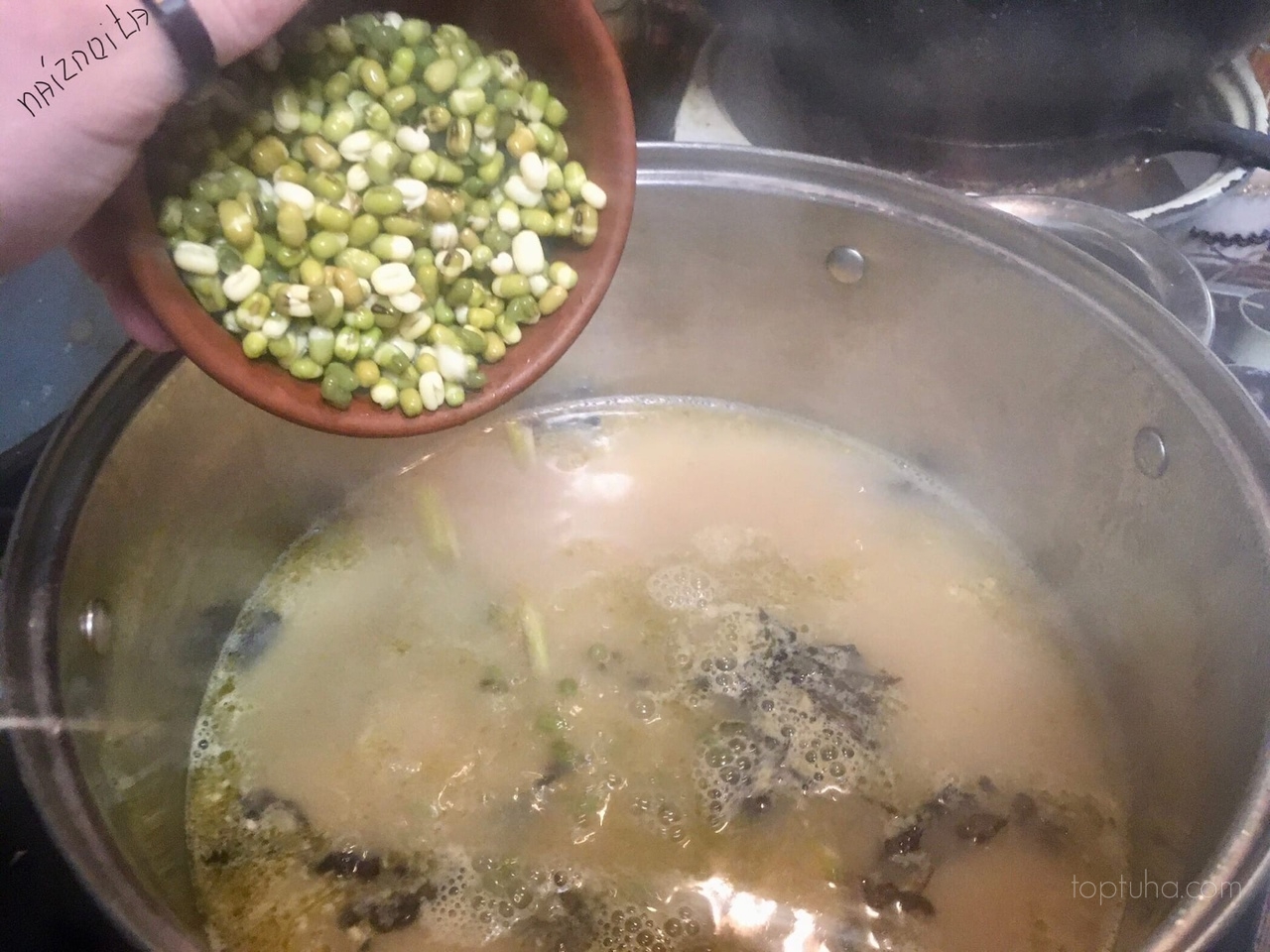 Добавляем маш, который для быстроты приготовления можно заранее замочить,