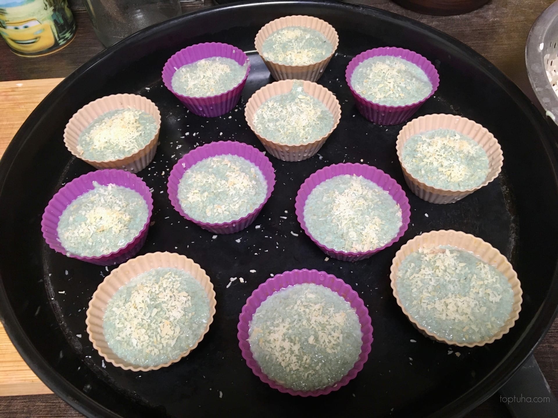 Но до края не досыпаем, тесто немного поднимется при выпекании. Посыпаем кокосовой стружкой и ставим в разогретую духовку на минут 20.