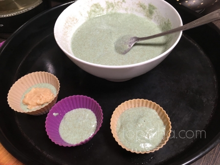 В формочки сыпем столовую ложку теста, чайную ложку начинки, снова столовую ложку теста.