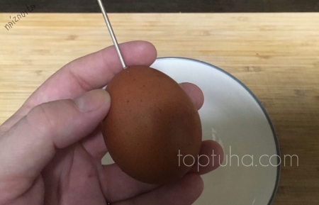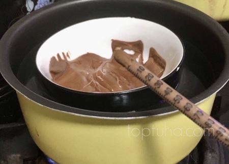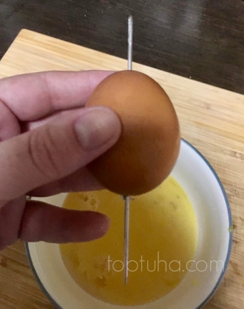 Ну и инструменты всякие незамысловатые. Шоколад топим на водяной бане. Пока топится, яйца протыкаем большущей иглой насквозь и хорошенечко вошкаем ей тудым-сюдым внутри яйца, чтобы разбить желток.