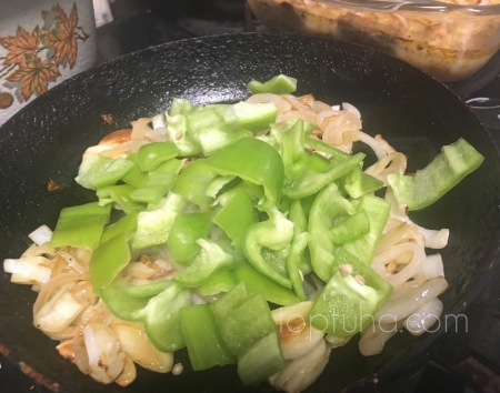 Незамедлительно приступаем к хулинарству! Лук режем четвертинами и обжариваем вместе с шестночными зубами.