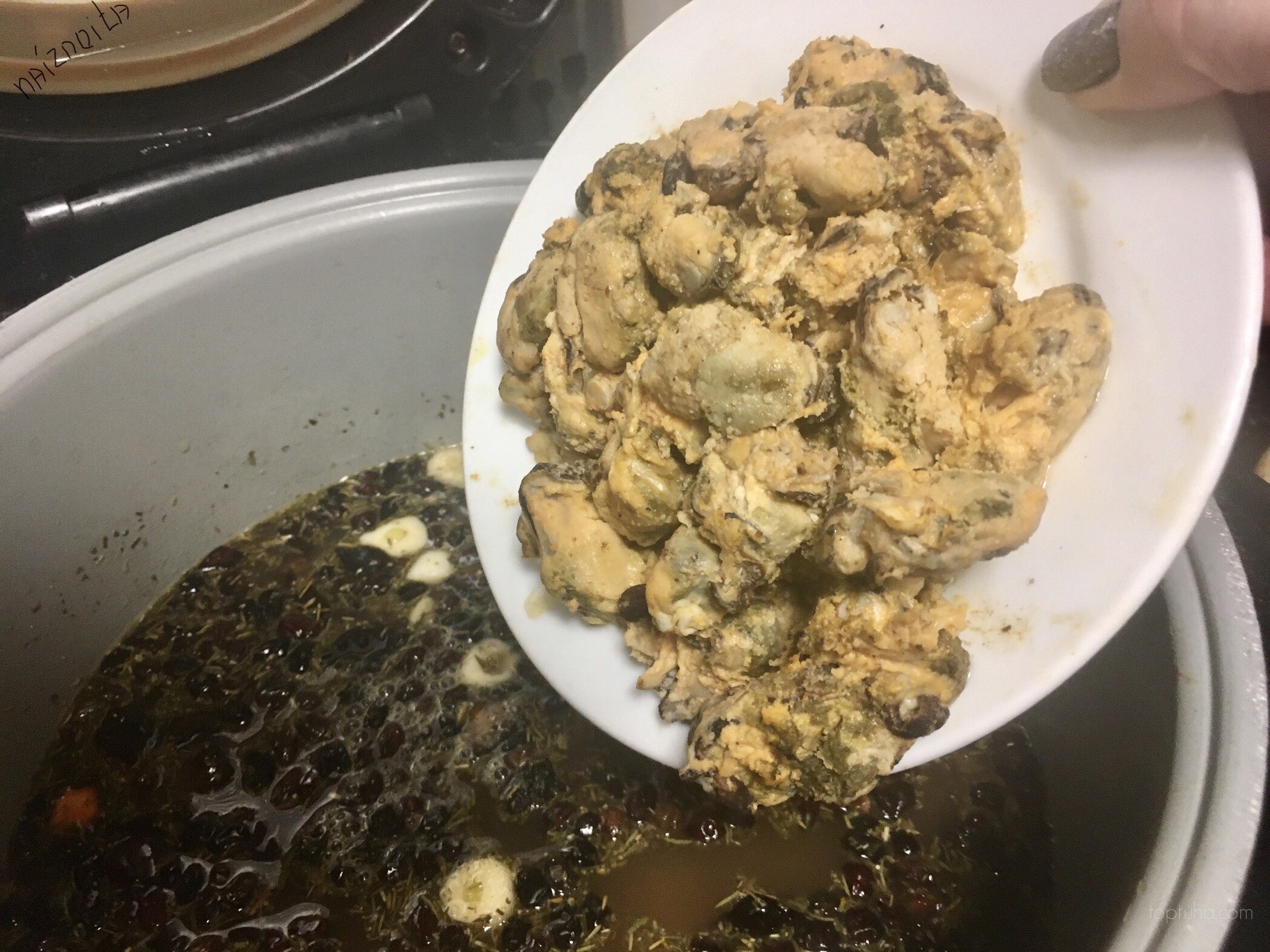 Куриную грудку рубим кусками, чтобы удобно было совать в ротовую полость. А вот обжаривать куру или нет - личное дело каждого. Следом плюхаем в варево мидии.