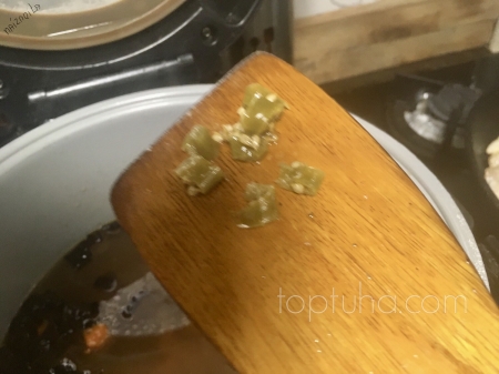 С ней всё просто удачно. Когда маш наполовину сварится добавляем обжаренные овощи, нарубленный острый перчик