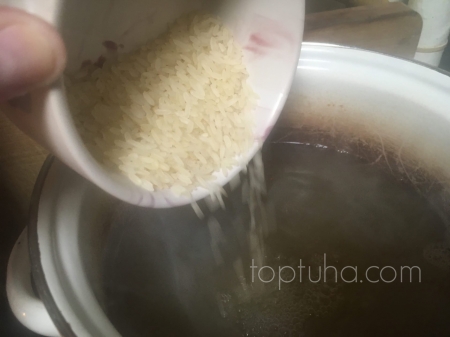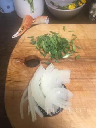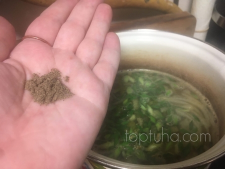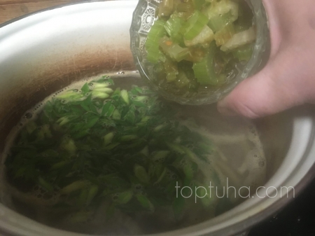 Когда рис почти сварился шинкуем все части лука и добавляем в суп.