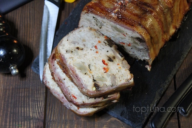 Вощем так! Думала, я думала, что на конкурс приготовить и вот такой пазл у меня сложился. Подбирала состав сама. Нет, конечно, идею самого террина и обертку беконом, я не изобретала, как то колесо, давно этим приемом пользуюсь. Но вот то, что внутри – это сама-сама. Не прогадала, пробуйте, очень вкусно. Когда покупала чернослив, здоровенный узбек сказал, мол, мне самый лучший. Я его спрашиваю: а другим, значит, худший? Он так завис на какое-то время, потом начал тарахтеть, что у него весь товар хаааароший! Я похихикала, есессно, что еще остается. Количество фарша определяла на глаз и напишу для своей формы. Но у меня все тютелька в тютельку получилось (машу отцу в небо платочком) Короче берем: три упаковки бекона по 145 грамм, у меня сыровяленый четыре куриные грудки по половине 250 грамм куриной печени две луковицы горсть кешью горсть чернослива (чот их там мало, но такая горсть) перец острый – 1 штука соль и перец молотые, паприка яйцо. Вроде все! Грудки, ясное дело, пропускаю через мясорупку вместе с луком. Печенку нарезаю полосками. В куриный фарш добавляю специи, соль и яйцо и вымешиваю зверски. Даже отбиваю, чтобы фарш стал совсем однородным. Режу чернослив, давлю орехи, кромсаю перец. Ничего не напоминает? Мне ничего не напоминает! ыыыыы Печень и все давлено-рубленное закидываю к фаршу и хорошо перемешиваю. Форму выстилаю беконом. Чем аккуратнее, тем красивее будет результат. Я, конечно, косячила... просто спешила. Да, и, если вы найдете длинный, отлично. Я не стала искать, меня этот устроил, тем более, что он вкусный. В этот момент, главное - его не сожрать. Выкладываю фарш, утрамбовываю. Можно постучать формой по столу. Закрываю остатками бекона. Форму накрываю фольгой, иначе бекон сразу начнет гореть и корячиться. Я уже проходила, ученая! Саму форму в большую с водой. И на 220 градусов. Наверное час у меня стоял, точнее не скажу. Но температуру минут через тридцать я убавила до 190. Вот так он выглядит целым. В конце я его, оп!, в большую форму перевернула и подпекла верхушку. Не стала упражняться и ждать когда сгорит в своей форме. Разрезаем! Красота, правда? Вощем, мне стыдно, но я в час ночи отъела корку. Просто молча отъела. Вострог ребята. Чернослив, как таковой, не чувствуется, но свое дело делает. Как и орехи, и перец. Да, и ярко выраженного вкуса печени тоже нет. Все прям сложилось. Разрез чуть ближе. Забыла, паприку добавляла, чтобы фарш окрасить, но она не сыграла. В следующий раз добавлю куркумы. И версия для слабовидящих! Спасибо за внимание! И приячтного аппетита, дорогие мои! Вернуться назад |