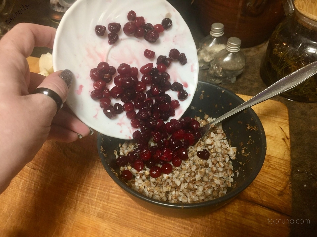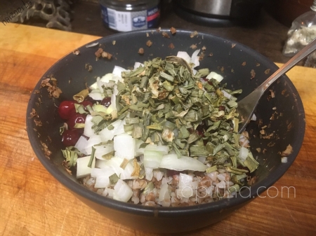 Высыпаем в кашу ягоды, добавляем накубиченный лук и зелень.